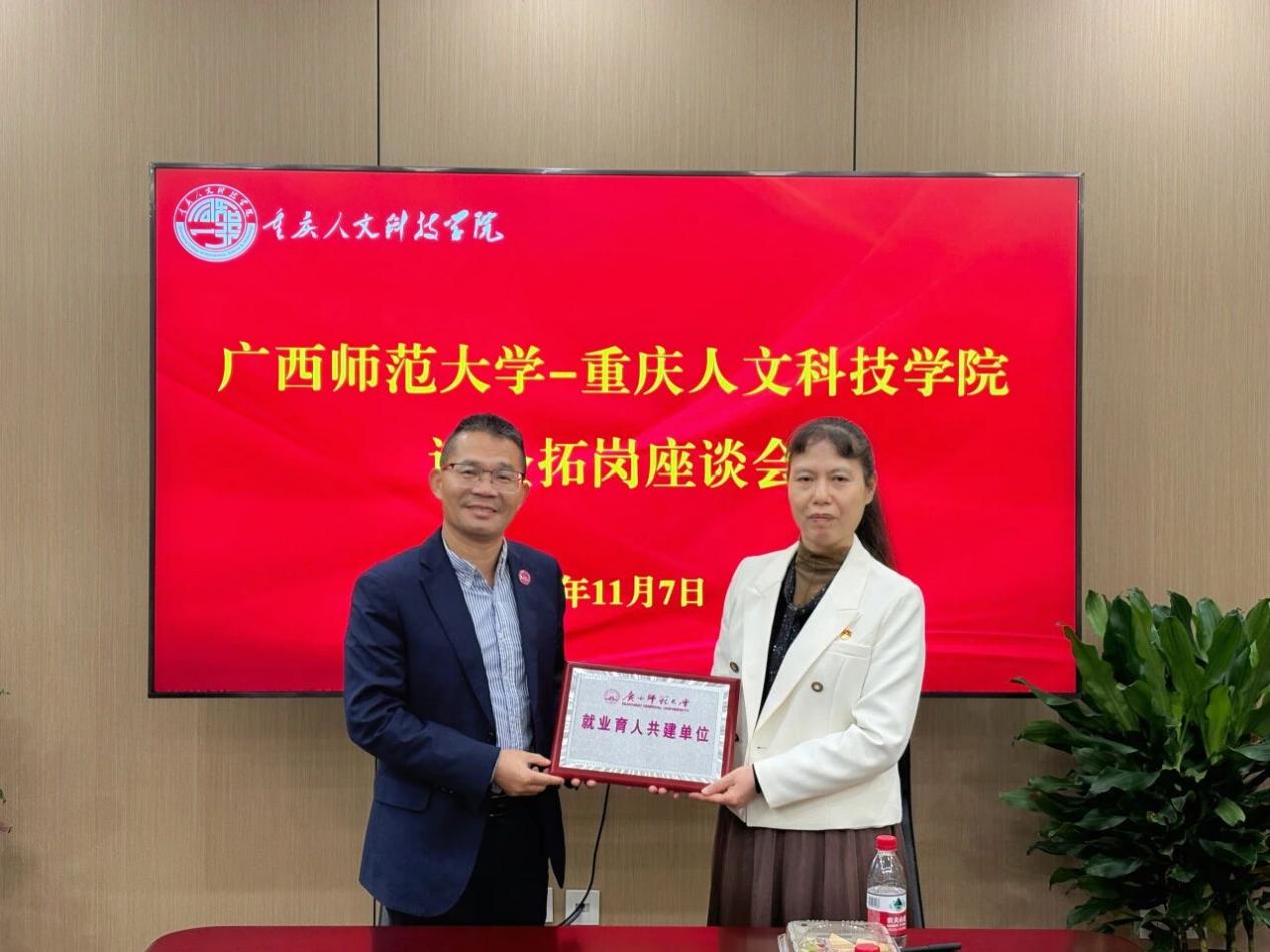 会上,广西师范大学毕业生、校友代表结合自身工作经历分享了在我校的成长感悟。在热烈的交流氛围中,双方举行了“就业育人共建单位”授牌仪式,标志着两校正式建立人才合作长效机制,为后续深度协作奠定了坚实基础。